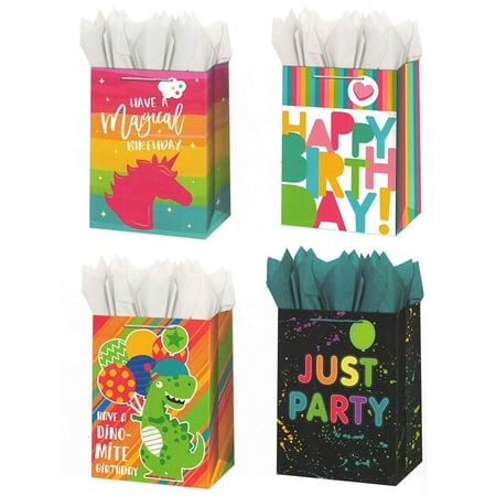 Pack Of 4 Large Birthday Party Gift Bags Assortment Of Foil And Glitter Embellishments Unicorn Dinosaur Set