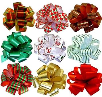 Christmas Gift Pull Bows 5 Wide Set Of 9 Red Green Gold Stripes Swirls Gift Bows Christmas Presents Birthday Boxing Day Hanukkah