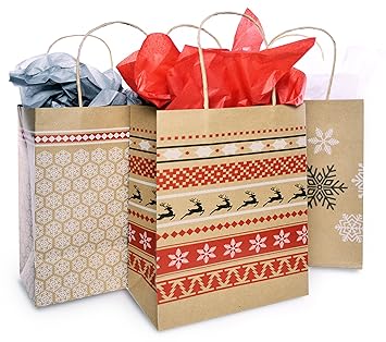 Christmas Gift Bag Set With Tissue Paper Included Red White Nordic Print Gift Bag Paper Kraft Bags In 3 Assorted Holiday Designs With Matching