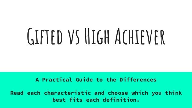 Gifted vs high achiever , The answer is of course e.When considering referring a student to the gifted and talented program it can often be easy to confuse a truly gifted learner with one that is a creative learner or even a high achiever. Christie mcwilliams gifted or high achiever there are clear differences between children who are high achieving and those who are gifted. High achieving and gifted learners have different motivations abilities and focuses. They take the hardest classes and ace them all.